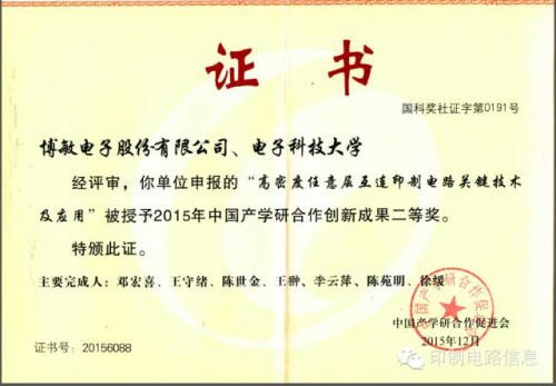 中國產學研合作促進會與云南省人民政府共同舉辦的第九屆中國產學研合作創新大會上,博敏電子與電子科大共同申報的“高密度任意層互連印刷電路關鍵技術及應用”項目榮獲創新成果二等獎。