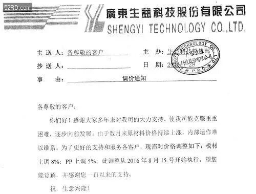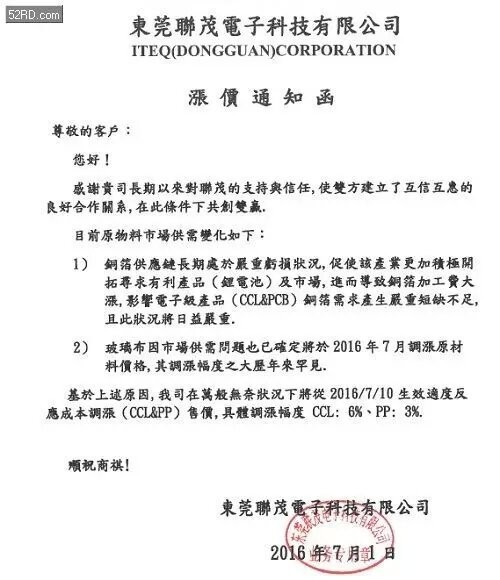 建滔積層板的漲價通知單:銅箔、半固化片、板料受原材料價格上漲將提價10%。