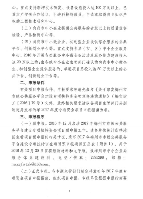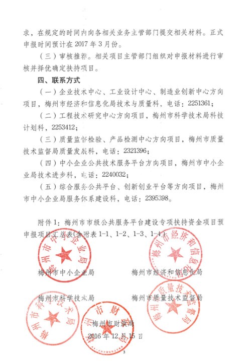 | 各縣(市、區)中小企業主管部門、經濟和信息化局(科工商務局)、科學技術局、質量技術監督部門、財政局,市直各單位: 根據市財政局、市中小企業局、市經信局、市科技局、市質監局《關于印發梅州市市級公共服務平臺建設專項扶持資金管理辦法的通知》(梅市財工〔2016〕79號)文件精神,為了做好2017年度公共服務平臺建設專項扶持資金項目申報工作,加快我市公共服務平臺建設,提升服務能力和水平,現將有關申報事項預通知如下: 一、項目類型和支持重點 (一)至2016年底已獲得地市級以上認定的企業技術中心、工業設計中心、制造業創新中心、中小企業公共技術服務平臺等; (二)2015年后經主管部門認定的省、市級工程技術研究中心。重點支持新增技術研發、設備設施及投入達100萬元以上,已簽定產學研合作協議,引進科技特派員、申請或取得自主知識產權的工程技術研究中心。 (三)向我市中小企業提供公共服務的省級以上的質量監督檢驗、產品檢測中心等; (四)向我市中小微企業、初創型企業提供綜合服務的公共平臺、創新創業平臺等。重點支持各縣(市、區)中小企業服務中心,2016年開展各類服務中小微企業活動及服務能力建設投入達20萬以上的;由各級中小企業主管部門確認的向我市中小微企業、初創型企業提供服務的,年度項目總投入達50萬元以上的公共平臺、創新創業平臺等。 二、申報條件 有關項目申報條件、申報要求等請先參考《關于印發梅州市市級公共服務平臺建設專項扶持資金管理辦法的通知》(梅市財工〔2016〕79號)文件,最終相關要求請以各項目主管部門分別制定并發布的年2017年度專項資金項目申報指南為準。 三、申報程序 (一)預申報。2016年12月啟動2017年梅州市市級公共服務平臺建設專項扶持資金項目預申報工作。請各單位統計所轄地區主管項目預申報的相關情況,填寫2017年梅州市市級公共服務平臺建設專項扶持資金項目預申報項目匯總表(附件1),并于2016年12月30日前將紙質材料和電子版,報梅州市中小企業局服務體系建設科,電話/傳真:2395398,郵箱:mzzxjfwtxk@163.com。 (二)正式申報。各專題主管部門制定并發布年2017年度專項資金項目申報指南,組織項目申報。申報單位根據申報指南要求,在規定的時間內向各相關業務主管部門提交相關材料。正式申報時間預計在2017年3月份。 (三)審核推薦。相關項目主管部門組織對申報材料進行審核并擇優確定扶持項目。 四、聯系方式 (一)企業技術中心、工業設計中心、制造業創新中心方向項目,梅州市經濟和信息化局技術與質量科,電話:2251361; (二)工程技術研究中心方向項目,梅州市科學技術局科技計劃科,2253412; (三)質量監督檢驗、產品檢測中心方向項目,梅州市質量技術監督局質量發展科,電話:2321396; (四)中小企業公共技術服務平臺方向項目,梅州市中小企業局技術進步科,電話:2240032; (五)綜合服務公共平臺、創新創業平臺等方向項目,梅州市中小企業局服務體系建設科,電話:2395398。 ![]() ![]() ![]() ![]() |