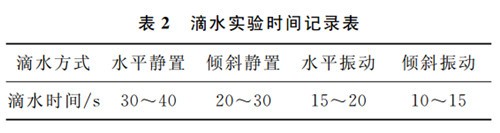 表2為水平靜置、 傾斜靜置、 水平振動和傾斜振動四種滴水方式的滴水時間統計( 以無明顯液滴滴下為滴水終點, 手動模擬振動)從以上驗證數據可以看出: 將滴水方式設置為傾斜振動, 能在較短的滴水時間內保證滴水效果。