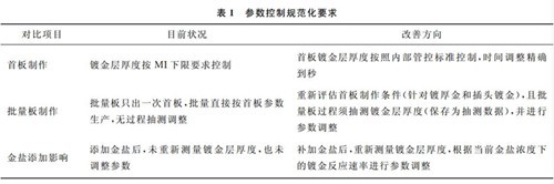 散件板與批量板穿插生產需要對首板制作、 批量板鍍金層厚度和金鹽添加過程進行管控, 具體改善要求如表1所示。