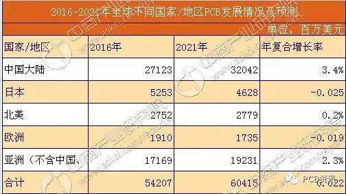 在2016年全球不同國家/地區PCB發展情況中,中國大陸PCB年產值達到271.2億美元,而日本、北美和歐洲分別為52.5億美元、27.5億美元及19.1億美元,隨著PCB產業中心的逐漸轉移,中國內地將保持持續穩定增長,預計2021年中國大陸PCB行業年產值將達到320.4美億元,年復合增長率預計為3.4%;而日本、北美和歐洲的PCB產業將面臨產業衰退的局面,年復合增長率分別為-2.5%、0.2%和-1.9%。