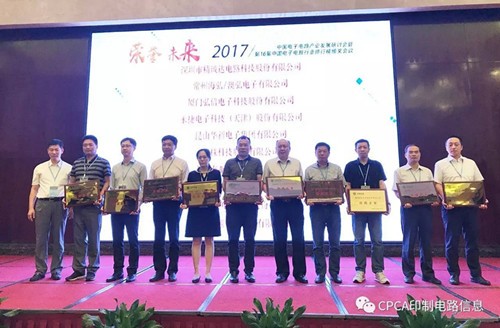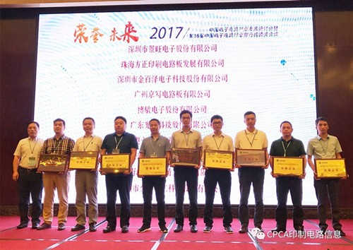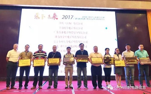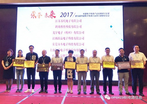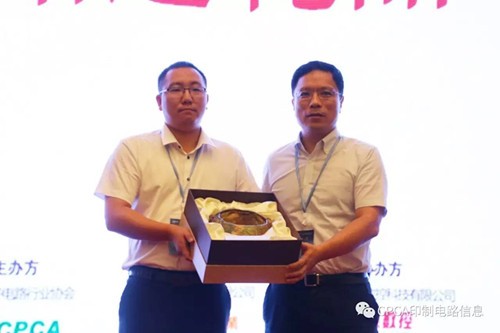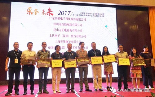 接下來進行第十六屆中國電子電路行業排行榜頒獎儀式,企業代表分批上臺從頒獎嘉賓高素梅執行秘書長、由鐳理事長、黃志東常務副理事長、王龍基名譽秘書長、張瑾秘書長、楊朝輝副理事長、蔡志浩副理事長、董曉軍副理事長、王毅副理事長、黃泰云副理事長、劉德威副理事長、陳興農副秘書長手中接過榮譽獎牌。