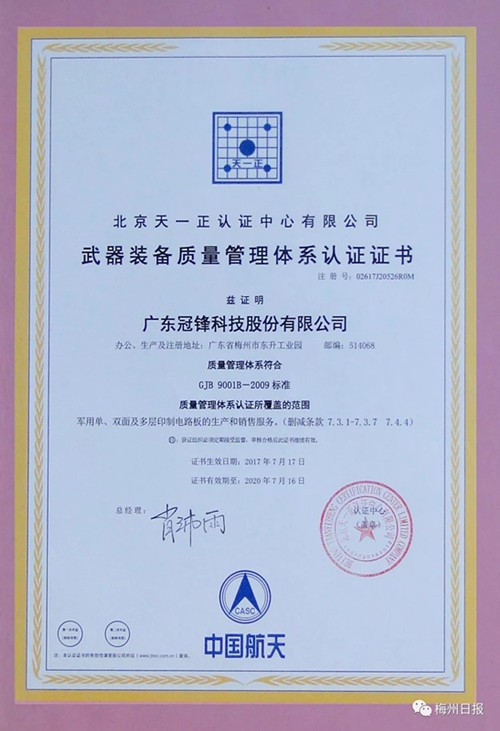 軍民融合產業發展基地位于梅州市東升工業園,計劃總投資10億元,項目擬用地100多畝。預計2018年1月開工,分兩期進行,兩年內全部竣工投產。在冠鋒科技“特種電路板”、“高精密電路板”研發生產技術優勢上,生產符合軍工產品各項質量體系認證的產品,包括航天航空電子設備、新型材料、智能控制設備、通信指揮設備、無人機設計與集成、無人機/衛星數據鏈、機載導航定位設備、飛行控制設備,等等。