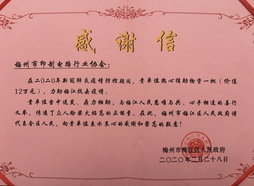 為抗擊新型肺炎疫情,MPCA會(huì)長(zhǎng)、秘書長(zhǎng)等領(lǐng)導(dǎo)組織各會(huì)員單位,積極為支持家鄉(xiāng)防控疫情捐款,募集到善款¥12萬元,以同等價(jià)值的防控疫情物資捐贈(zèng)給梅州市梅江區(qū)慈善會(huì),大家助力抗擊新型冠狀病毒感染的肺炎疫情,主動(dòng)承擔(dān)企業(yè)的社會(huì)責(zé)任,充分發(fā)揮積極參與、支持家鄉(xiāng)的疫情防控工作, 共克時(shí)艱,共同戰(zhàn)“疫”。今天,梅州市梅江區(qū)人民政府對(duì)我們協(xié)會(huì)進(jìn)行表彰和感謝,并頒發(fā)了感謝信證書,再次感謝44家單位的愛心捐款,為社會(huì)貢獻(xiàn)一份愛心和力量。