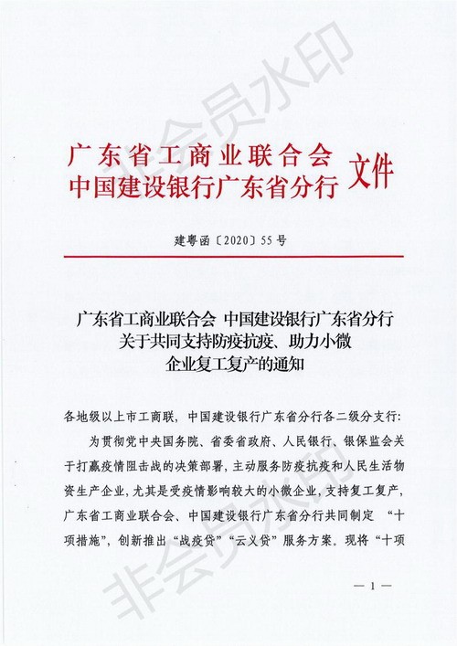 廣東省工商業聯合會+中國建設銀行廣東省分行關于共同支持防疫抗疫、助力小微企業復工復產的通知