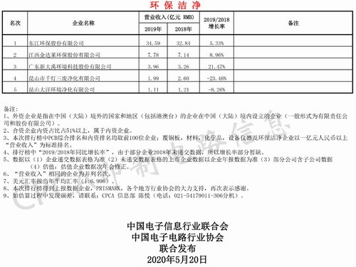1. 2019年入榜企業5家,合計營業收入49.43億元人民幣,2018年入榜企業9家,合計營業收入55.36億元人民幣,2019/2018環保潔凈入榜企業營業收入同比下降10.71%。