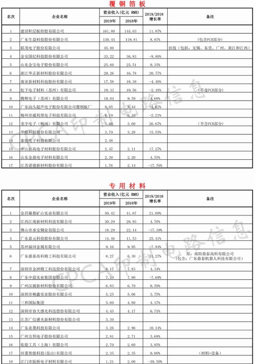 1. 2019年營業收入入榜企業17家來看,合計營業收入454.16億元人民幣(去掉廣東生益中包含的生益電子部分:30.95億元人民幣,已計入PCB部分),2018年入榜企業18家,合計營業收入合計508.08億元人民幣,2019/2018覆銅板入榜企業營業收入同比下降10.61%。