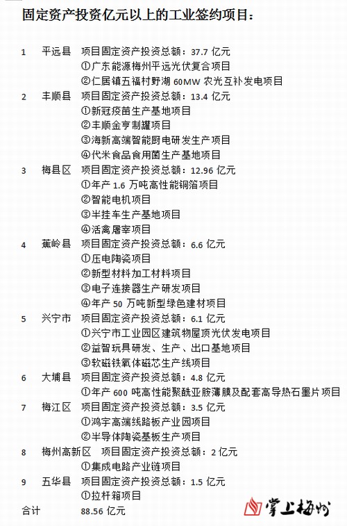 市委常委、市政府黨組副書記黃文沐主持會議。會上,副市長溫向芳通報全市工業經濟發展情況并提出工作打算;梅縣區、興寧市、五華縣作工作匯報,廣東嘉元科技股份有限公司、廣東富遠稀土新材料股份有限公司、梅州圣戈班汽車玻璃系統有限公司作交流發言。大會還舉行各縣(市、區)政府、梅州高新區與本地2021年新引進并可開工的固定資產投資(含新增資擴產)總額億元以上的工業合同項目企業簽約儀式。