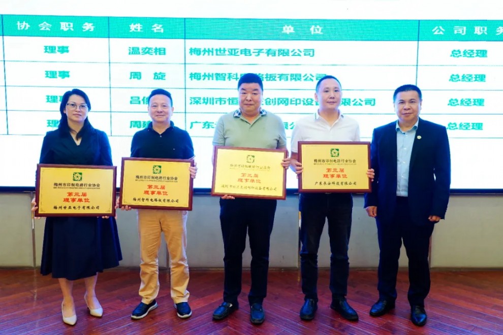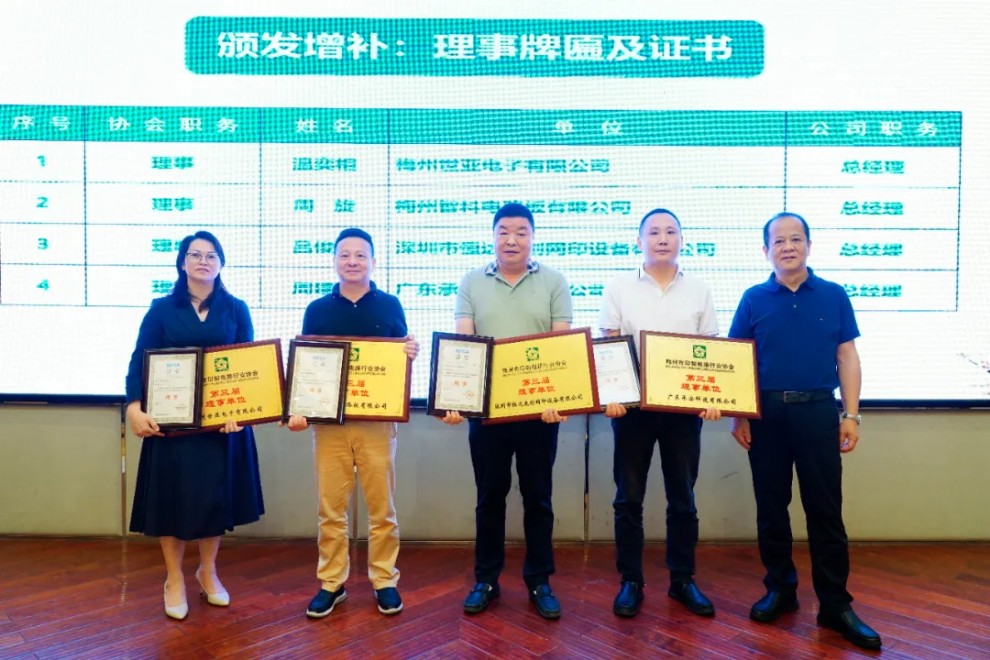 隨后,會議表決通過了四家新增理事單位,分別是梅州世亞電子有限公司、梅州智科電路板有限公司、深圳市恒達友創網印設備有限公司、廣東承安科技有限公司,并頒發牌匾和證書。