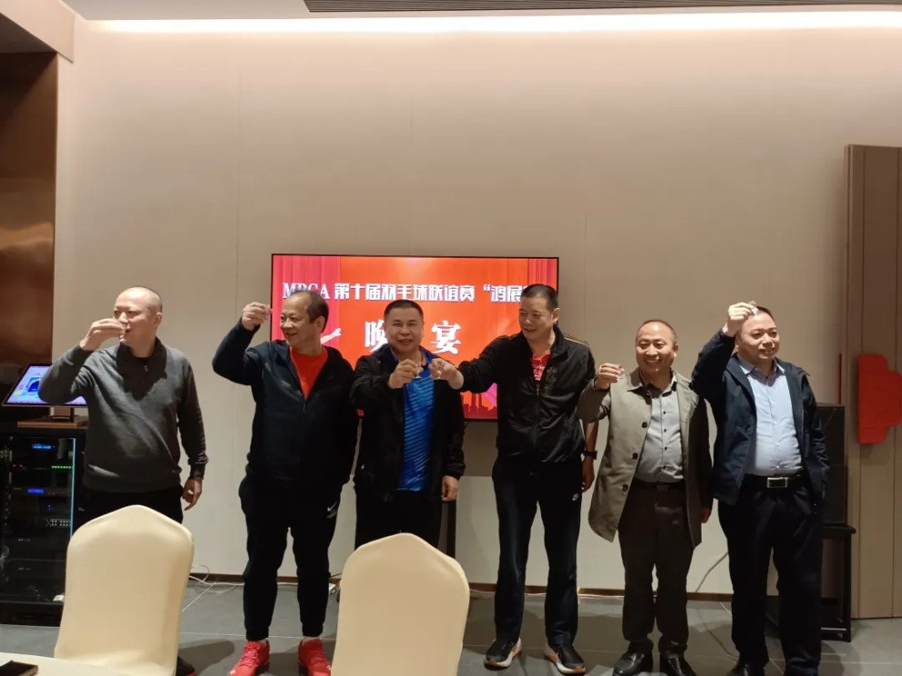 MPCA名譽會長徐緩董事長、名譽會長謝堅生董事長,會長何德英、副會長兼秘書長韓志偉、副會長兼監事長林鏡波、鴻展機電總經理劉長春為晚宴祝酒,祝賀本次羽毛球聯誼賽取得圓滿成功。