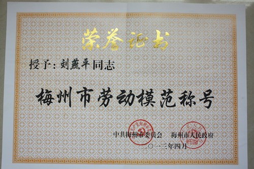 MPCA會長、博敏股份公司常務副總劉燕平女士深入貫徹落實科學發展觀,認真執行黨的路線方針政策,遵守國家法律法規,立足崗位,奮發進取,開拓創新,勇于奉獻,在推動綠色經濟崛起,為建設富庶美麗幸福梅州偉大實踐中作出貢獻。經中共梅州市外經貿系統直屬機關委員會推薦,由中共梅州市委員會、梅州市人民政府評選為“梅州市勞動模范稱號”!